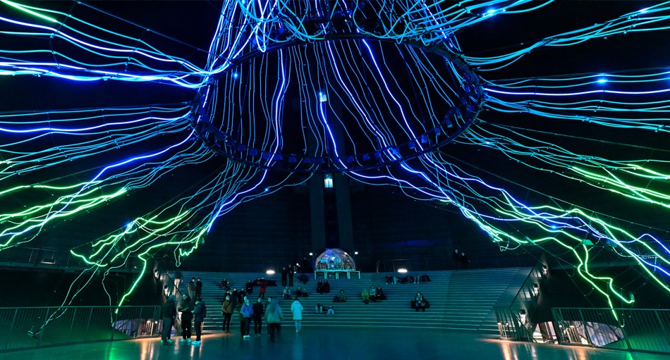 In der „Neuen Mitte“ befindet sich nicht nur das Veranstaltungszentrum des diesjährigen GTM, die „König-Pilsener-ARENA“, sondern auch das Wahrzeichen der Stadt, der 117 Meter hohe Gasometer Oberhausen. Das weithin sichtbare Industriedenkmal ist heutzutage eine spektakuläre Ausstellungshalle. Bis 30. Dezember 2026 ist hier die Ausstellung „Mythos Wald“ zu sehen. Mit großformatigen, teilweise erstmals zu sehenden Bildern und Filmsequenzen zeigt der Gasometer, dass Wälder mehr als nur eine Ansammlung von Bäumen sind. Dazu widmet sich die Ausstellung den einzigartigen Tier- und Pflanzenwelten. Den dramaturgischen Höhepunkt bildet eine bisher noch nie realisierte Kunstskulptur mit starkem Österreich-Bezug: „Der Baum“ ermöglicht als größte Innenraum-Lichtkunstinstallation der Welt einen einmaligen Blick aus dem optisch gestalteten Wurzelwerk hinauf in die 35 Meter hoch aufsteigende Baumkrone. Erschaffen wurde er von den Pionieren der Medienkunst, den „Ars Electronica Solutions“ aus Linz, untermalt von einer eigens dafür vom Österreicher Rupert Huber komponierten Musik.