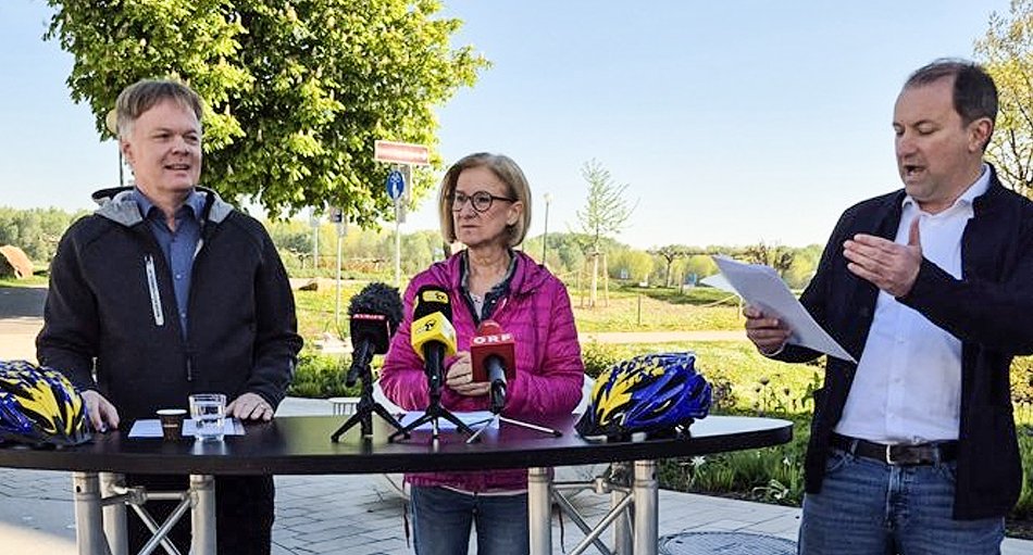 Zum Mediengespräch über die neue Rad-Saison baten vor kurzem NÖs Landeshauptfrau Johanna Mikl-Leitner (Mi.), der Chef des NÖ Tourismus, Michael Duscher (l.), und jener der Region „Donau Niederösterreich“, Bernhard Schröder (r.).