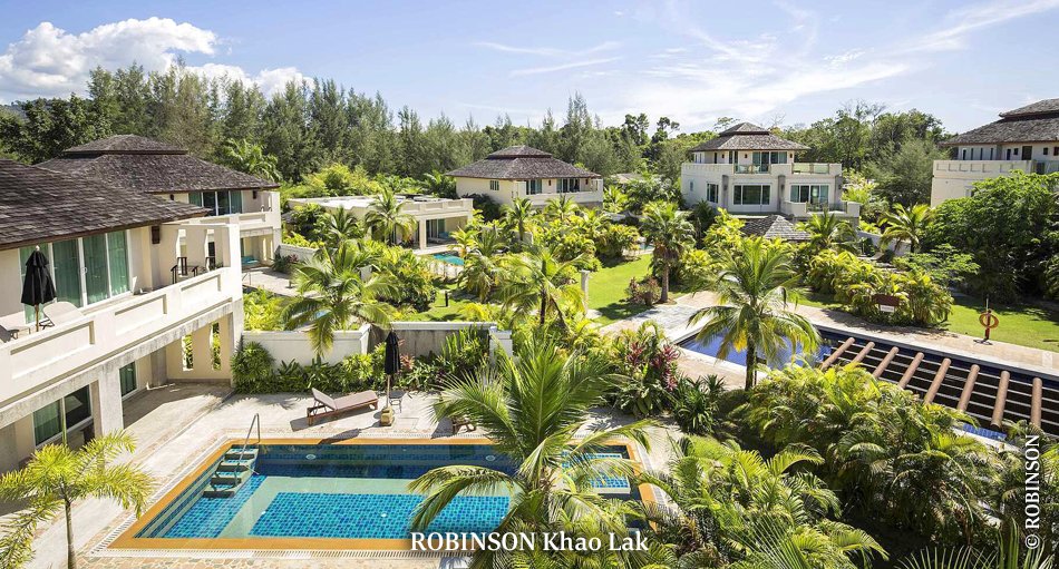 Der Rundgang durch die sich über 272.000 m² erstreckende Anlage zeigte, welches Kleinod sich ROBINSON hier geangelt hat (ROBINSON besitzt 47,5 % der Anteile, den Rest hält der Immobilien-Entwickler Vitya Holding Co). Die 320 Zimmer verteilen sich auf das dreistöckige Haupthaus (209 Standard- und Familienzimmer) sowie auf Pool Villas (Silvi Redo: „Wir nannten den ROBINSON Khao Lak deshalb auch den Club der 100 Pools“), zu denen auch solche mit „Ocean View“ gehören. Einige sind mit zwei Schlafzimmern, Küche etc. ausgestattet. Absolutes Highlight ist die zweistöckige MEGA Villa Deluxe für insgesamt 12 Personen. Insgesamt stehen im ROBINSON Khao Lak 15 Kategorien zur Wahl.