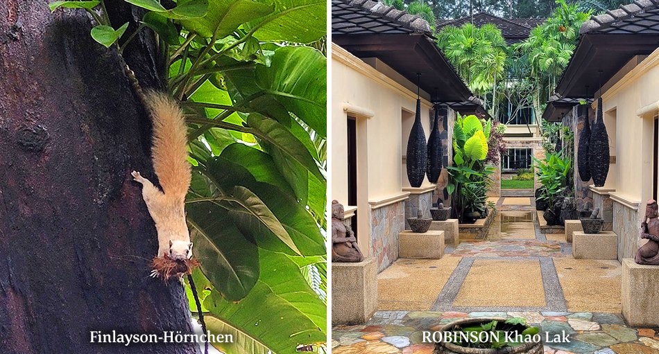 Auffallend, weil überall präsent (obwohl scheu) und ein beliebtes Foto-Motiv: die Finlayson-Hörnchen. Ursprünglich stammten sie aus Chiang Mai im Norden Thailands, wurden aber vom früheren Eigentümer importiert und die Hörnchen (anfänglich 30 Stück) vermehrten sich extrem. Adam Szkopp: „Die Gäste füttern sie gerne, aber sie knabbern alles an. Das ist ein großes Problem.“