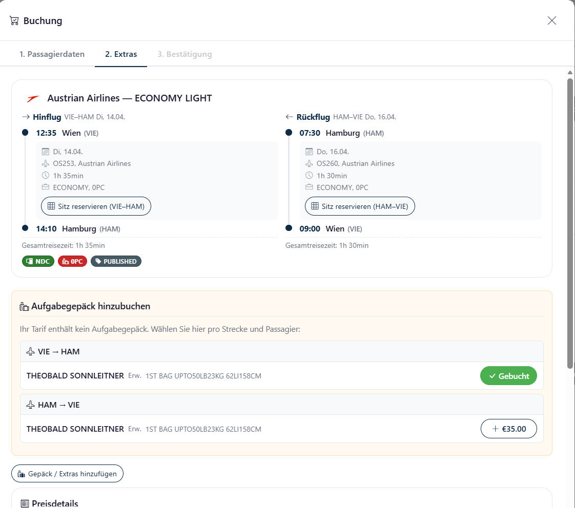 Um das zu untermauern, bringt Theo Sonnleitner zwei typische Beispiele aus der Praxis für eine Urlaubsreise („Hallo, ich suche einen Flug von Wien nach Bangkok, Abflug zwischen 10. und 15. Juli, Rückflug 1. August, Economy, bitte keine Umsteigezeit unter 2 Stunden“) und eine Geschäftsreise („Ich benötige nächsten Dienstag einen Frühflug von Wien nach Hamburg, Rückflug Donnerstagabend, nach Möglichkeit direkt, Business Class. Am Mittwoch habe ich einen Termin um 9 Uhr morgens“).