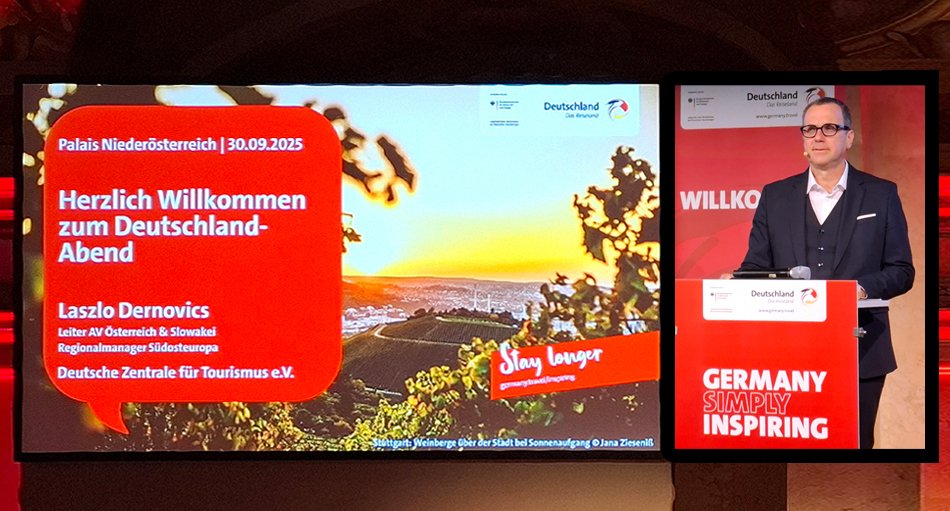 Zum Deutschland Abend hatte die Deutsche Zentrale für Tourismus (DZT) diese Woche in das Palais Niederösterreich im Herzen von Wien eingeladen. In exklusivem Ambiente standen nicht nur Präsentationen der Partner am Programm, auch das leibliche Wohl kam mit Speisen vom Flying Buffet nicht zu kurz. Aus der Bundesrepublik waren in Summe 13 Touristiker:innen von folgenden Institutionen angereist: Bayern Tourismus Marketing GmbH, Investitions- und Marketinggesellschaft Sachsen-Anhalt mbH, Leipzig Tourismus und Marketing GmbH, Regensburg Tourismus GmbH, Ruhr Tourismus GmbH, Technik Museen Sinsheim Speyer, Thüringer Tourismus GmbH, Tourismus Marketing Gesellschaft Sachsen mbH, Tourismus NRW e.V., Tourismusverband Franken e.V., Tourismusverband Mecklenburg-Vorpommern e.V., Wiesbaden Congress & Marketing GmbH und Zweckverband Bergerlebnis Berchtesgaden. Als Airline-Partner trat die Lufthansa Group auf, die den Fokus auf die Neuheiten bei Austrian Airlines lenkte.