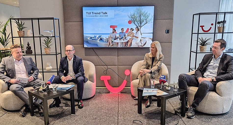 Für den „TUI Trend Talk Sommer 2026“ knapp vor der Eröffnung der Ferien-Messe Wien hat sich das TUI Austria-Team rund um den CEO Gottfried Math etwas Besonderes einfallen lassen: Es ließ aus Deutschland den CEO der TUI Hotels & Resorts (allen voran TUI Magic Life, TUI Blue und Robinson), Bernd Mäser, sowie Wybcke Meier, die CEO von TUI Cruises (Mein Schiff und Hapag-Lloyd Cruises), einfliegen, unter Moderation von Aage Dünhaupt, den Kommunikationschef der TUI für die DACH (Deutschland, Österreich und Schweiz)-Länder und Polen sowie Chef der Kommunikation und PR für die Airlines, Hotels und Kreuzfahrten des Konzerns, einfliegen.